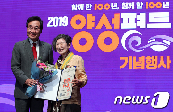 이낙연 국무총리가 4일 오후 서울 중구 대한상공회의소 국제회의장에서 열린 2019 양성평등주간 기념식에서 윤석남 화가에게 국민훈장 모란장을 수여한 뒤 기념촬영을 하고 있다. ‘평등을 일상으로-함께 한 100년, 함께 할 100년’을 주제로 열린 이날 행사에서는 3·1 운동과 대한민국임시정부 100주년을 맞아 지난 100년간 여성운동과 성평등 실천 운동의 발자취를 돌아보는 내용으로 진행됐다. 2019.7.4/뉴스1